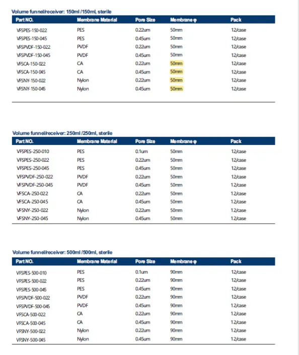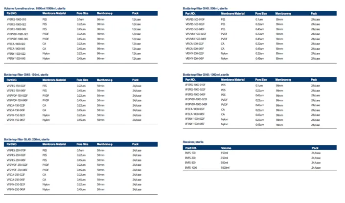 Extreme-low Protein Binding <1.5% (PES). Excellent Thoughput, for faster filtration and more process volume. Glass fiber pre-filter is available. Ergonomic design for convenient use and stable filtration. GL45 threads accepts commonly used bottle style. 產品應用選擇: